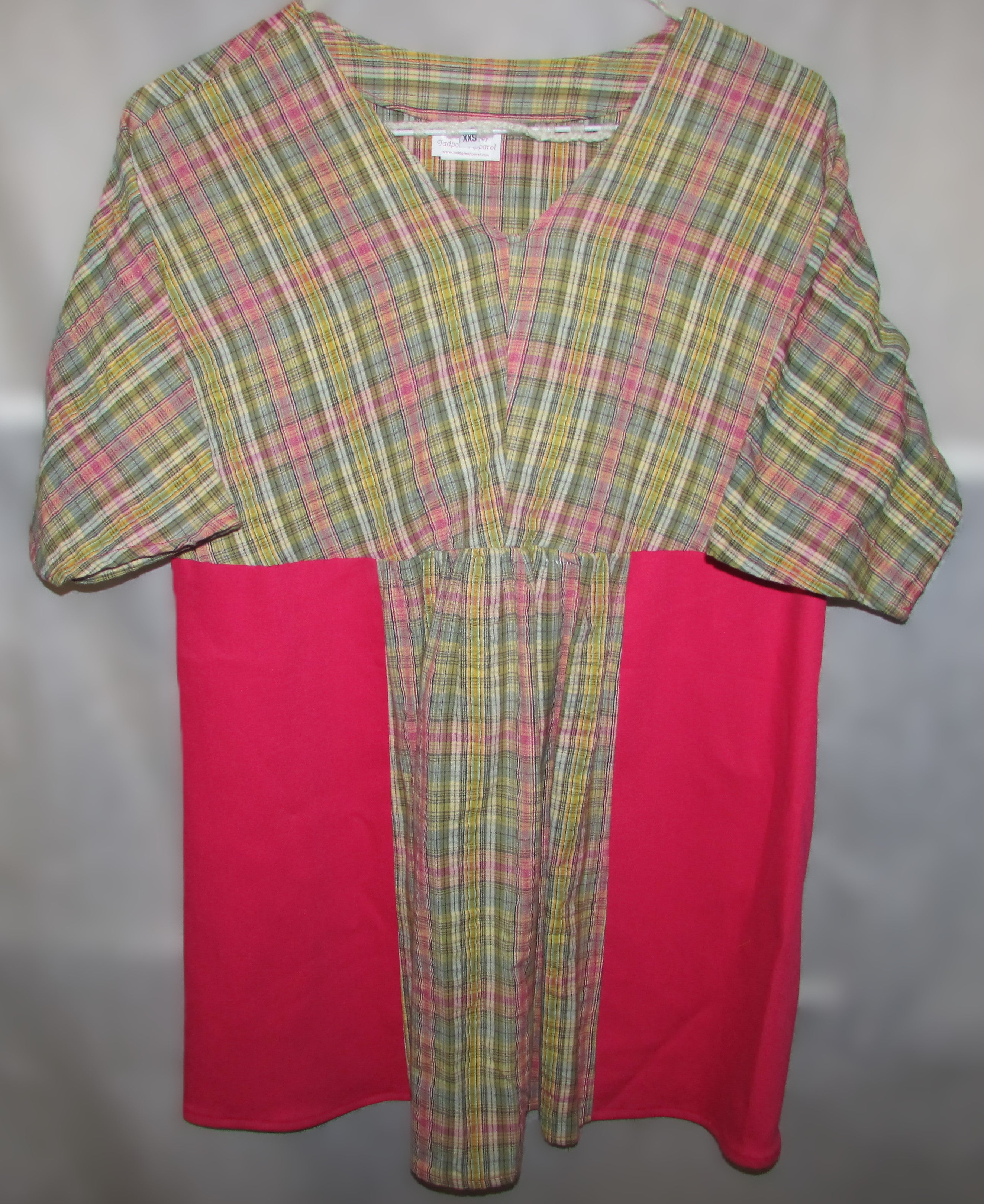 Add some playful gingham and denim to your wardrobe with this pink and green plaid women's blouse. It's the perfect mix of quirky and stylish for any occasion. Don't miss out on this unique piece!